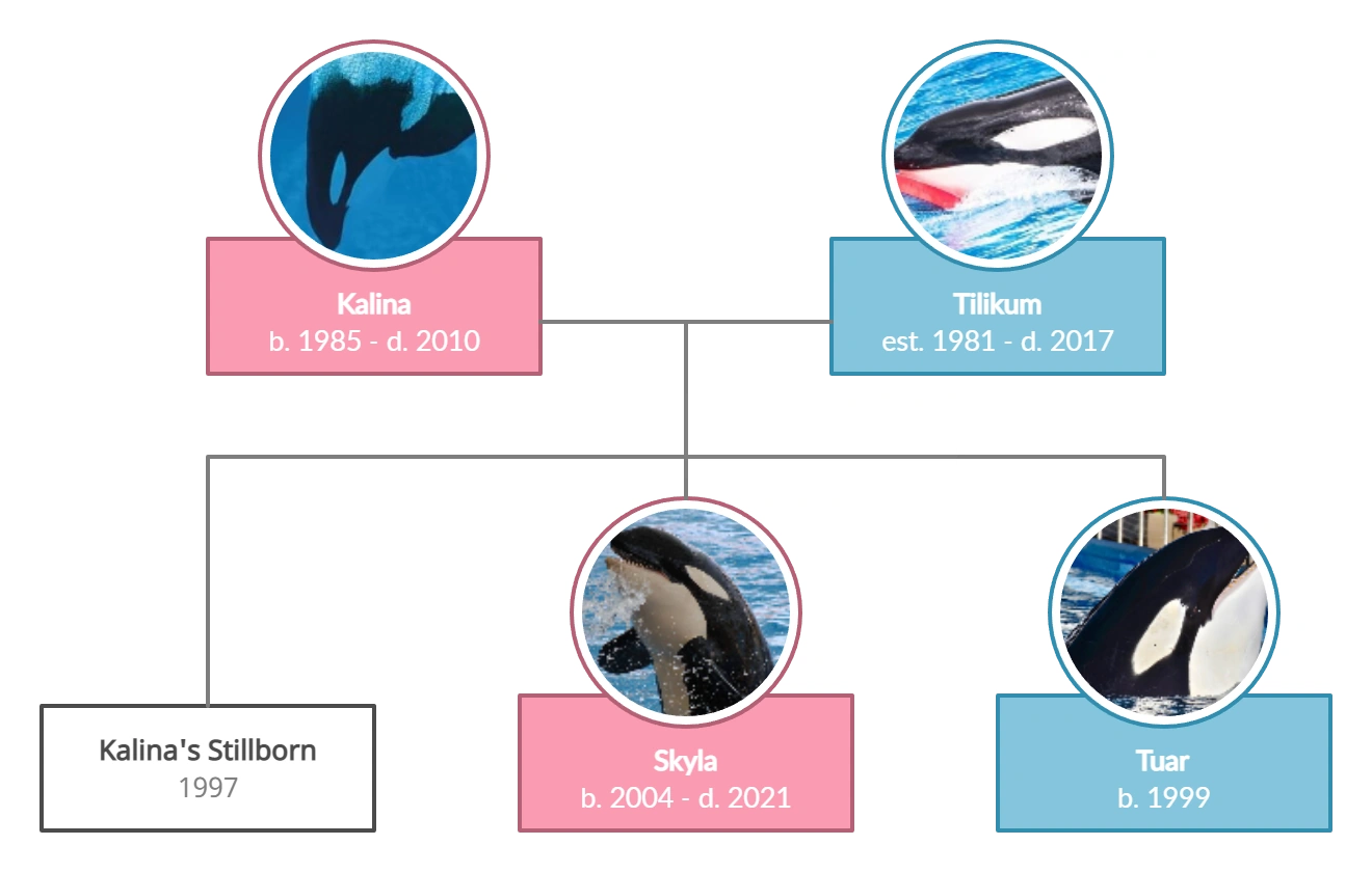 On February 9th, 2004, Kalina gave birth to her fourth calf following a seven hour long labor. Five months later, in July 2004, the calf was named Skyla.[3] At the time of her birth, eight other killer whales lived at the park: her mother and father, her grandmother Katina, her full-brother Tuar, her half-brothers Taku and Tekoa, her uncle Ikaika, and an unrelated female named Taima. As a calf, Skyla was independent and grew close with Ikaika, who was around the same age as her.